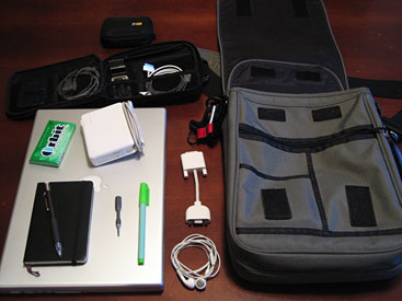 Coming to this pretty late, but… my sac courant de choix would be the Timbuk2 Blogger Bag (though I’m not much of one). Holds my 13” Macbook very nicely, power adapter, portable hard drive, buncha stuff for writing and writing on, the odd cable, etc. with lots of space to spare. The laptop compartment also fits a MacBook Air in an Incase Neoprene Sleeve — which I’ve recently switched to for carrying around daily. For more formal engagements I go with a Perry Ellis Full Flap Messenger. Thanks for sharing yours (made me order the STM Alley Case), but what I’m now more curious about is what goes in to your Moleskin. :-)