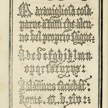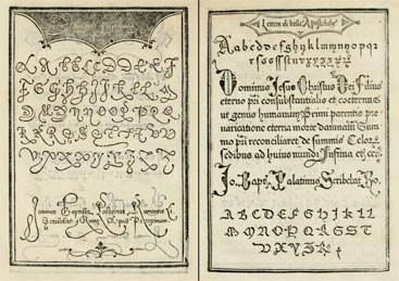 This jewel of a book was published in 1550 by Antonio Blado asolano in Rome. It is now available on the web and contains of complete alphabets, from chancery scripts, to blackletter and roman. There are also greek, hebrew, Cyrillic, Syrian, Arabic and other alphabets.